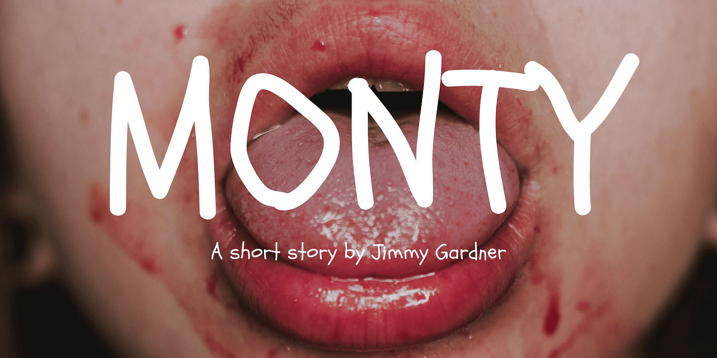 I dreamed I was swimming in Monty’s mouth, rolling over her tongue; sliding, soaking in her fluids. She juggled me like a Jolly Rancher, clacked me against her teeth, slipped me between her lip and gum, slipped me out again. She pinned me between her teeth and squeezed, slow and steady, harder, harder, my body about to pop like a Gusher. I shot awake with the sounds of cracking ribs and sucking spit echoing in my ears.